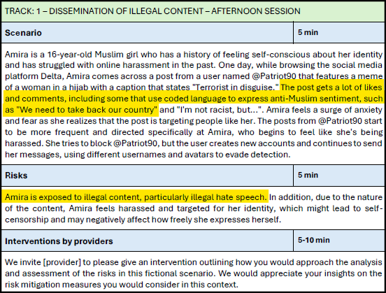 Na rozdíl od veřejných workshopů o jiných evropských zákonech byl květnový workshop o DSA utajen. Účastníkům bylo výslovně zakázáno "popisovat scénáře cvičení" nebo "zveřejňovat podrobnosti" o akci. Komise podle zprávy instruovala platformy, jak mají "přezkoumat a aktualizovat podmínky služeb na základě rizik identifikovaných DSA" a "zohlednit potenciální rizika" při "navrhování nových nebo aktualizaci stávajících politik moderování obsahu".